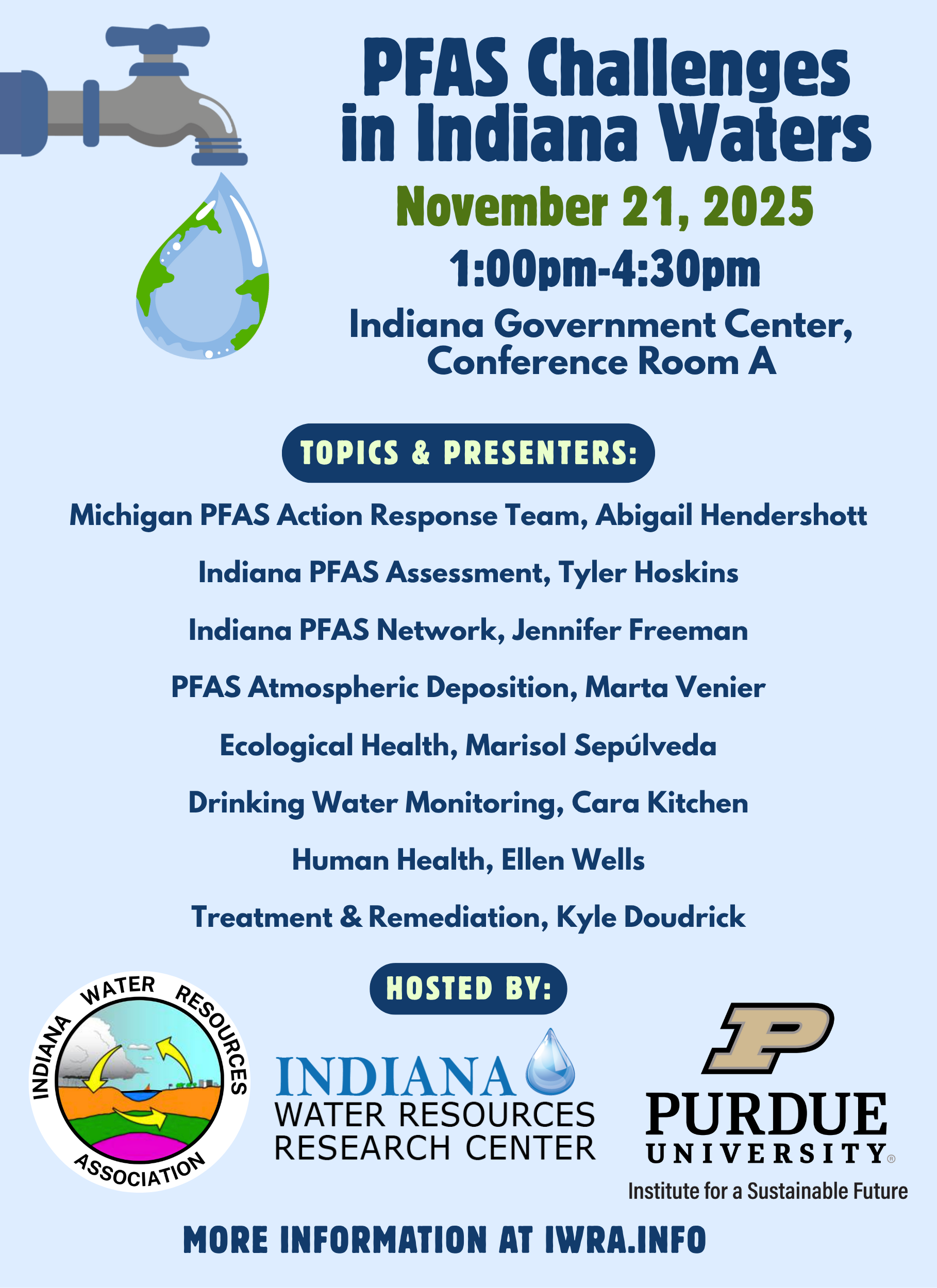 The Indiana Water Resources Association is co-hosting the “PFAS Challenges in Indiana Waters” Science Symposium on the afternoon of Friday, November 21, 2025 at Indiana Government Center, Conference Room A (402 W Washington St, Indianapolis, IN 46204) with the Indiana Waters Resources Research Center (IWRRC), and Purdue University’s Institute for a Sustainable Future (ISF). The event will last from 1:00pm until 4:30pm.